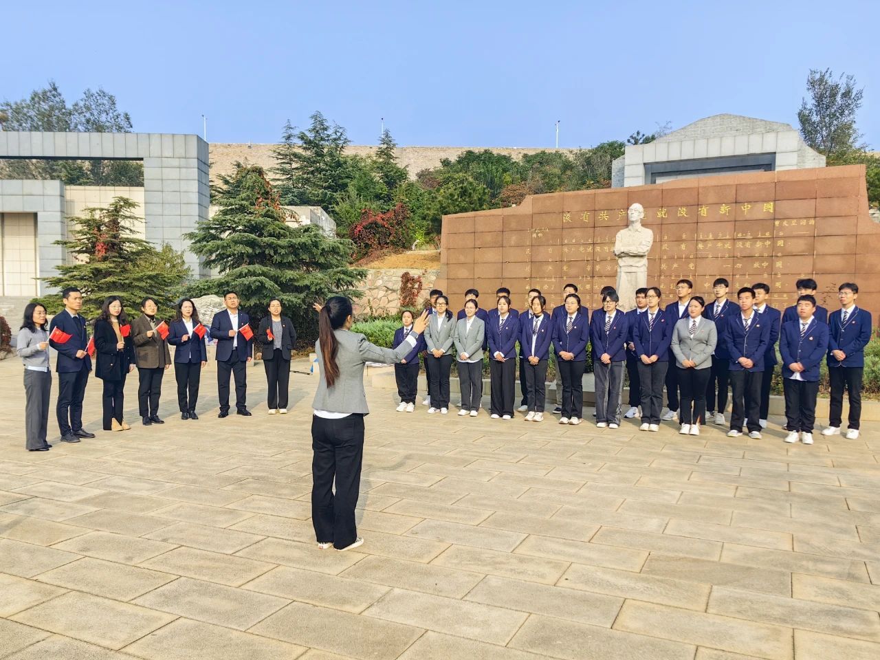 唱响红色旋律,弘扬革命精神。马克思主义学院专任教师岳会丹在纪念碑前结合时代背景以曹火星和歌曲《没有共产党就没有新中国》为主题进行了现场教学,全体师生党员在广场前共同唱响了这首著名的红色歌曲,歌声高昂激越,如同冲锋的号角,激励人心,表达了对党的忠诚和对革命前辈的敬仰。