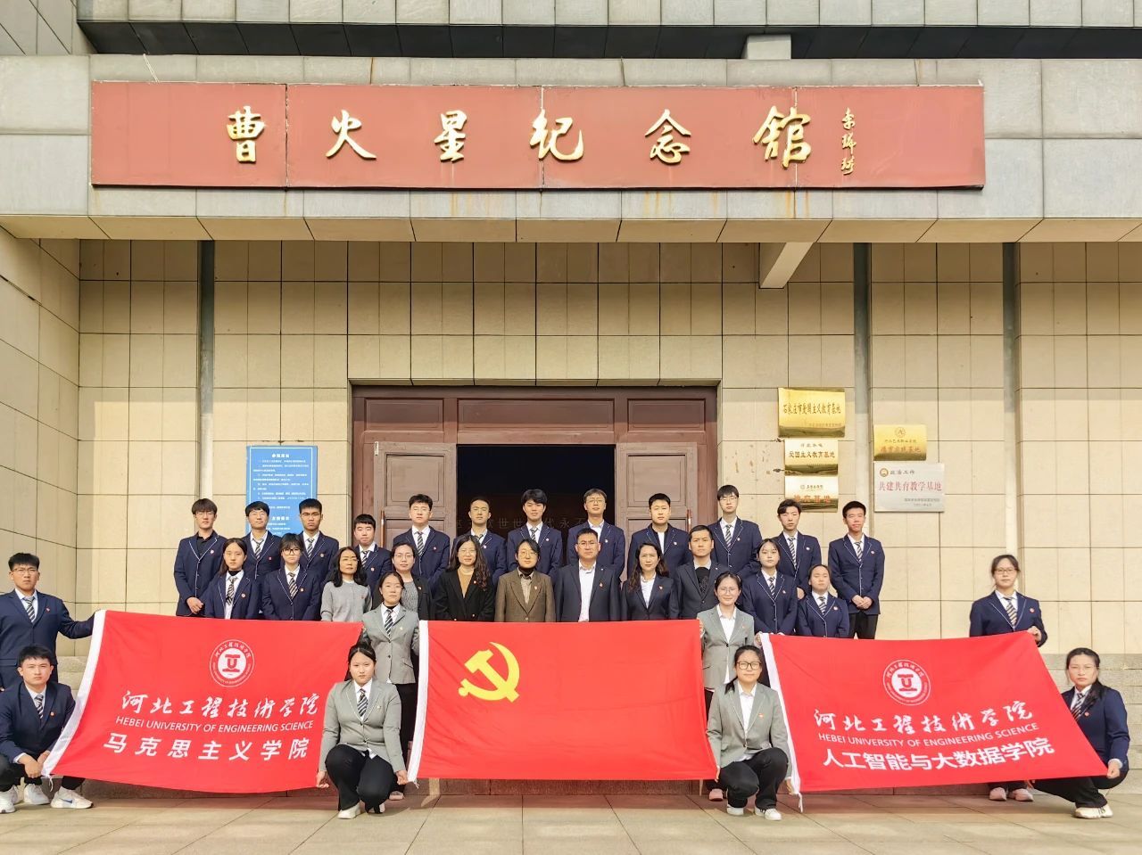 追溯峥嵘岁月,传承爱国精神。全体师生党员走入曹火星纪念馆,认真观看了纪念馆内陈列的照片、实物等史实材料,观摩词曲作者曹火星同志的创作手稿。学习人民音乐家曹火星的成长历程及《没有共产党就没有新中国》的创作背景和历史影响。参观结束后,在场馆前举行了纪念仪式并合影留念。