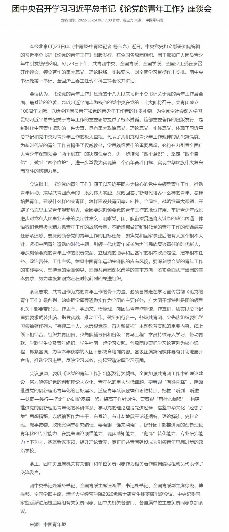 简介 中央党史和文献研究院编辑的习近平总书记《论党的青年工作》出版发行,在全国各级团组织、团干部和广大团员青少年中引发热烈反响。6月23日下午,共青团中央、全国青联、全国学联、全国少工委在京召开座谈会,领会著作的重大意义、理论脉络、实践要求,对全团学习贯彻作出安排。