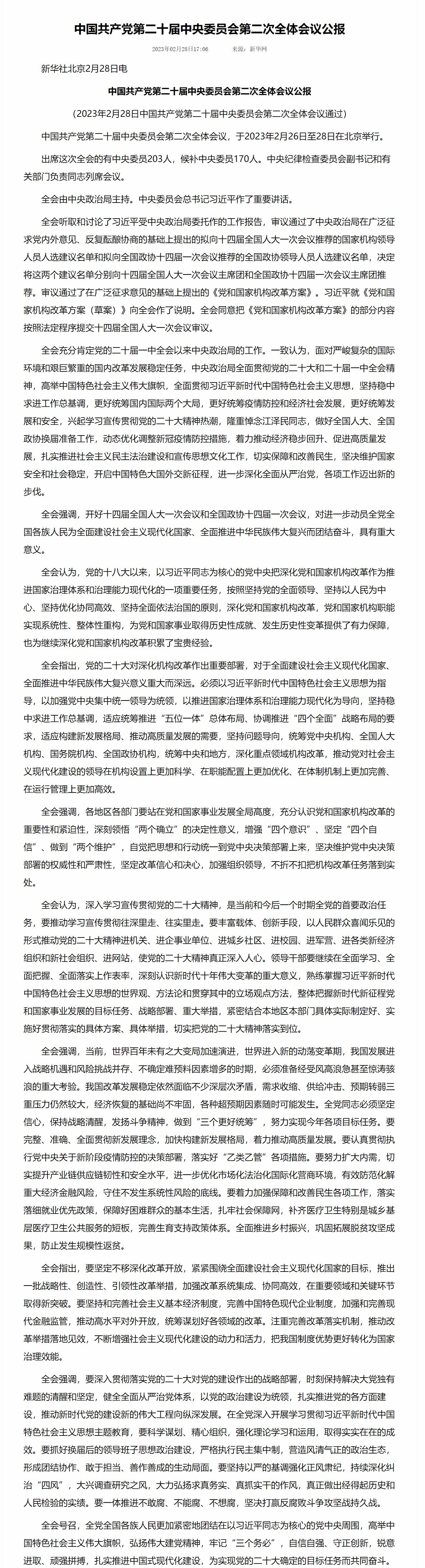 中国共产党第二十届中央委员会第二次全体会议,于2023年2月26日至28日在北京举行。