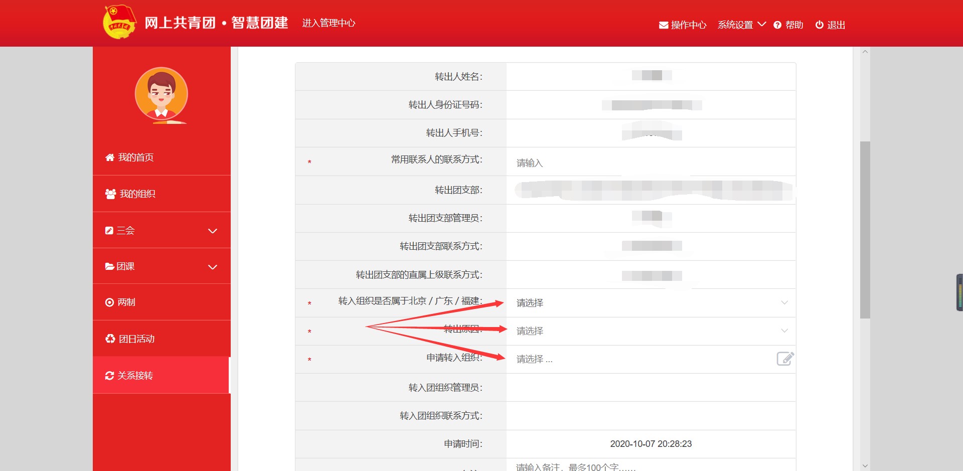 打开网址:https://zhtj.youth.cn/zhtj/signin 或者直接搜“智慧团建”登录账号为团员本人的身份证号码,初始密码是身份证号后6位或后8位。(初次登陆系统,会弹出修改密码的窗口,建议改完后收藏以免日后忘记密码。)登录后点击关系转接,填写资料。