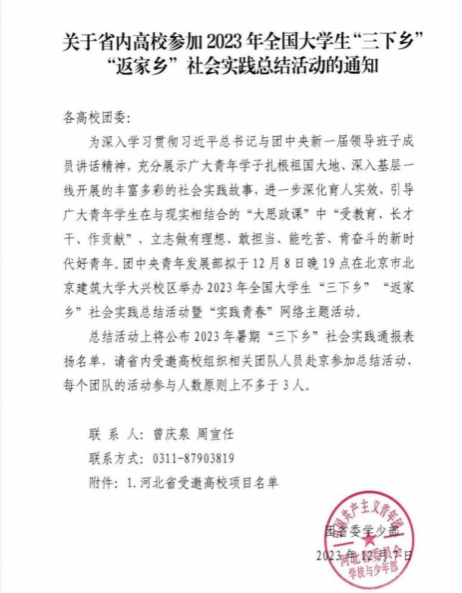 2023年12月8日人工智能与大数据学院“听党话,跟党走”实践团队受共青团中央邀请赴京参加2023年全国大学生“三下乡”“返家乡”社会实践总结暨“实践青春”主题分享活动。