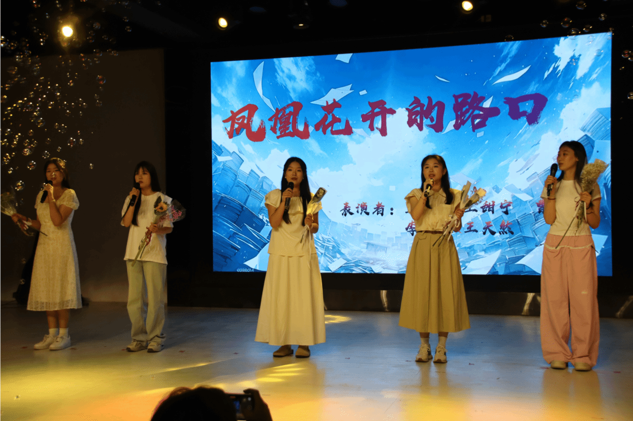 歌曲表演《凤凰花开的路口》:王佳曼,王甜宁,曹佳辉,李天一,王天然五位同学带来的这首歌曲,用歌声诉说青春的离别与重逢,让观众感受到青春的短暂与珍贵。