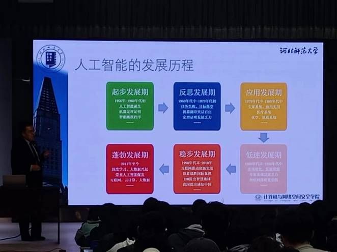 讲座中,王威博士结合自身海外读博经历,从人工智能发展历程、人工智能现状、人工智能产业、人工智能未来、人工智能融合应用等方面向学生们展开讲解,指出如今对人工智能的炒作远大于实际发展水平,通用人工智能仍处于起步阶段,专用人工智能在一些领域已经发展的十分优秀,人工智能如今正处在高速发展时期,发展前景广阔。