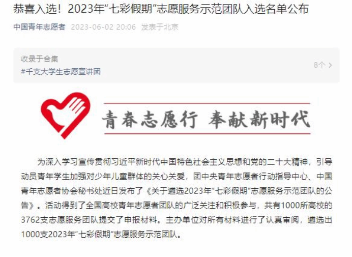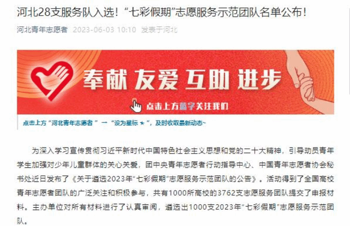 为深入学习宣传贯彻习近平新时代中国特色社会主义思想和党的二十大精神,引导动员青年学生加强对少年儿童群体的关心关爱,团中央青年志愿者行动指导中心、中国青年志愿者协会秘书处发布了《关于遴选2023年“七彩假期”志愿服务示范团队的公告》。本次活动得到了全国高校青年志愿者团队的广泛关注和积极参与,共有1000所高校的3762支志愿服务团队提交了申报材料。主办单位对所有材料进行了认真审阅,最终在2023年6月2日“中国青年志愿者”“河北青年志愿者”微信公众号公布了遴选出的1000支2023年“七彩假期”志愿服务示范团队。taptap点点官方网站人工智能与大数据学院“小智公益团队”成功如选。
