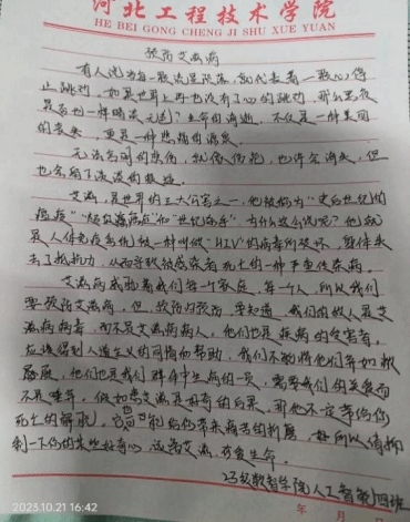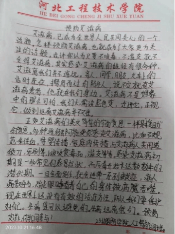 (3)人工智能与大数据学院于2023年3月22日-30日举办了以“禁毒防艾,青春有爱”为主题的征文比赛。过本次活动的开展,提高同学们远离毒品、预防艾滋的意识,倡导积极向上的青春理念和文明健康的生活方式,真正使珍惜生命、远离毒品、预防艾滋理念深入人心,营造健康文明的校园环境!