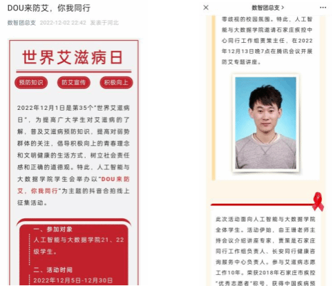 (2)人工智能与大数据学院通过“数智团总支”微信公众号、人工智能与大数据学院QQ号、人工智能与大数据学院抖音号等网上平台宣传防艾知识。