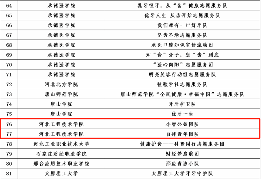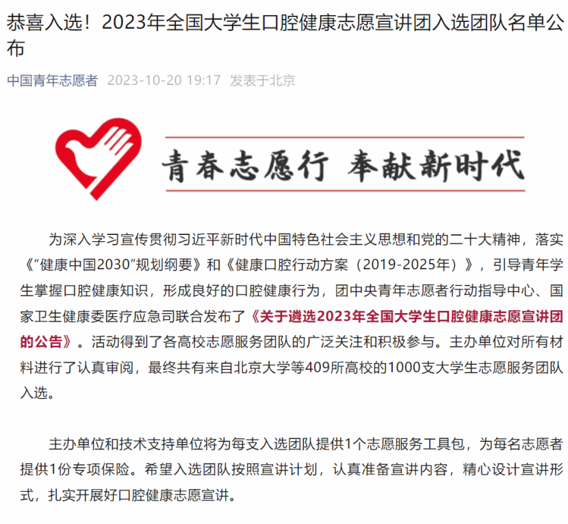 为深入学习宣传贯彻习近平新时代中国特色社会主义思想和党的二十大精神,落实《“健康中国2030”规划纲要》和《健康口腔行动方案(2019-2025年)》,引导青年学生掌握口腔健康知识,形成良好的口腔健康行为,团中央青年志愿者行动指导中心、国家卫生健康委医疗应急司联合发布了《关于遴选2023年全国大学生口腔健康志愿宣讲团的公告》。活动得到了各高校志愿服务团队的广泛关注和积极参与。主办单位对所有材料进行了认真审阅,最终在2023年10月20日“中国青年志愿者”微信公众号公布了遴选出的1000支大学生志愿服务团队。taptap点点官方网站人工智能与大数据学院“小智公益团队”“自律青年团队”成功入选。