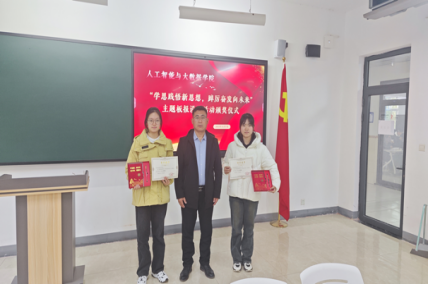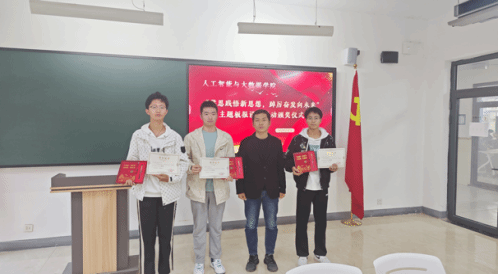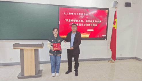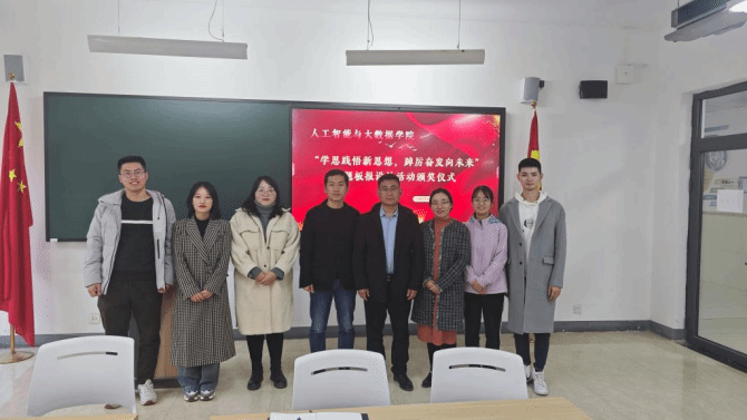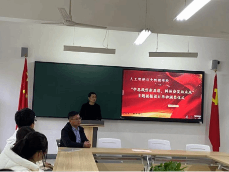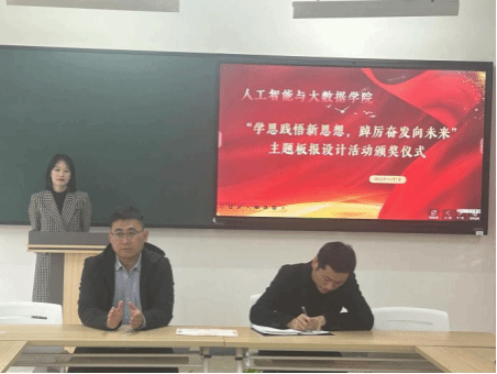 为深入学习宣传贯彻习近平新时代中国特色社会主义思想和党的二十大精神,着力加强青年思想政治引领和价值引领,在全体青年中掀起学习习近平新时代中国特色社会主义思想的浪潮,切实做到学深悟透、融会贯通,真正用于武装头脑、指导实践、推动工作,推动taptap点点大学生习近平新时代中国特色社会主义思想入脑、入心,人工智能与大数据学院于2023年11月7日下午在次教举行了“学思践悟新思想,踔厉奋发向未来”主题板报设计活动的颁奖仪式,参与本次活动的有人工智能与大数据学院党总支书记、学管副院长尹钧,马克思主义学院副院长苗正超,人工智能与大数据学院学管办主任、思政教研室副主任杨家腾以及获奖班级辅导员、学生代表,本次活动由人工智能与大数据学院思政教研室主任李亚鑫主持。