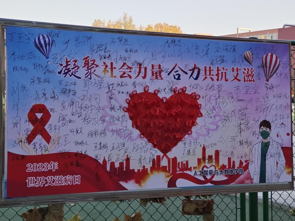2023年12月1日是第36个“世界艾滋病日”,为做好艾滋病防治的宣传教育工作,提升学生自我保护意识,2023年12月1日下午人工智能与大数据学院在旧操场西侧举办了以“凝聚社会力量,合理共抗艾滋”为主题的艾滋病防治宣传教育活动。