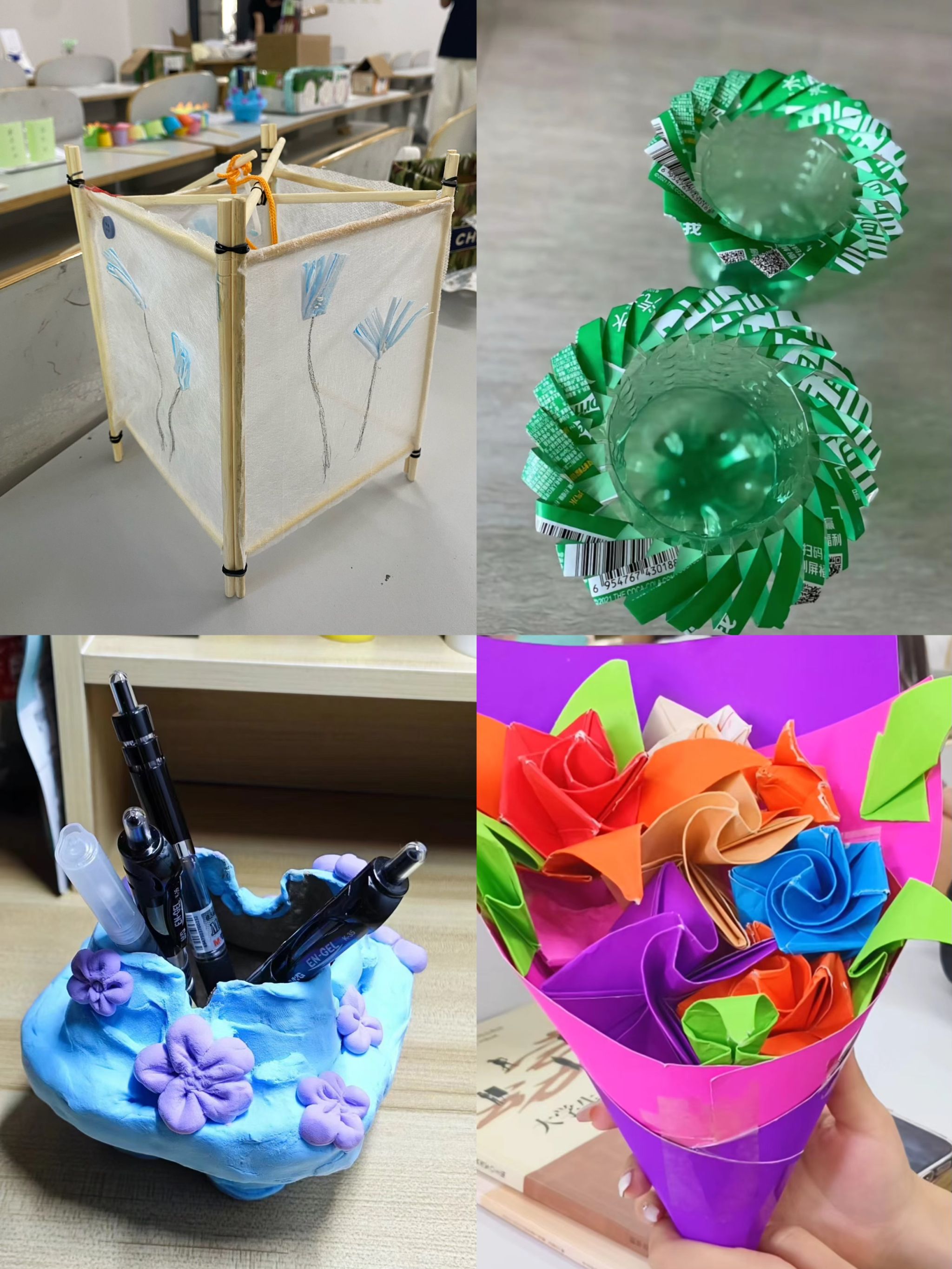 自5月13日开展活动以来,学生们积极参与,收集身边的废弃物,如废纸、废塑料、废布料等,并开始着手设计和制作。在制作过程中,他们充分发挥自己的创造力,用自己的双手完成了一件件绚丽多彩,创意丰富的手工作品。毫不起眼的快递纸盒、平平无奇的A4纸、废旧的矿泉水瓶......在经过同学们的精心裁制、组合、粘贴,变成了一座摩天轮、一个收纳盒、一只小动物等创意作品,惟妙惟肖,形象逼真,充分体现了学生的环保意识和创新能力。