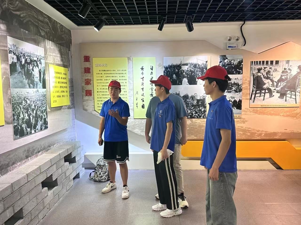 随后,红韵智旅团走进抗震纪念馆,首先映入眼帘的是周恩来总理在慰问灾区群众大会上讲话形象的汉白玉全身塑像。通过参观抗震纪念馆,实践团队了解了邢台地震的历史背景、地震的破坏程度、救援行动以及灾后重建等相关资料,看到了由著名作曲家李劫夫谱曲的歌曲《天大地大不如党的恩情大》的歌词:“天大地大不如党的恩情大,爹亲娘亲不如毛主席亲,千好万好不如社会主义好,河深海深不如阶级友爱深......”,深深的表达了灾区人民对党和政府的无限感激,对毛主席的深厚感情以及对社会主义制度的坚定信念。歌词中的这些话语不仅仅是简单的对比,更是灾区人民内心真实情感的流露。