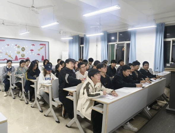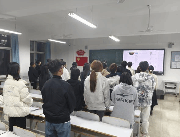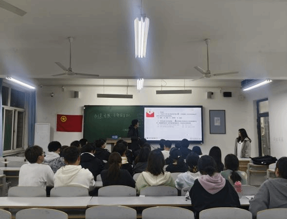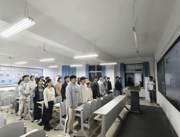 各个支部以知识竞赛的形式为本次活动注入活力。其中,有两个支部相聚于同一间教室,共同开启这场充满挑战与趣味的知识之旅。活动伊始,全体成员起立,激昂的团歌在教室中回荡,每一位同学都精神饱满,展现出对共青团的热爱与敬意。团歌的旋律不仅唱出了青年的朝气,更凝聚了各个支部成员的心。