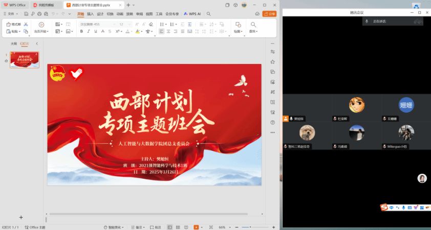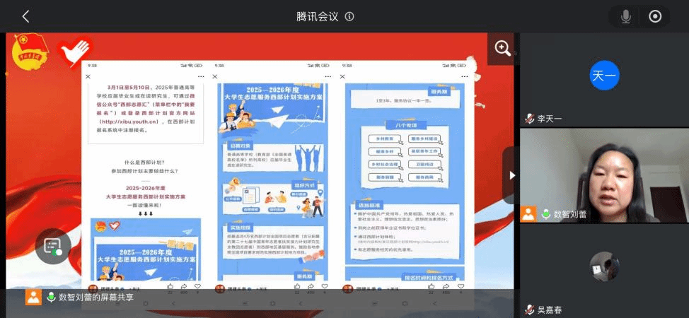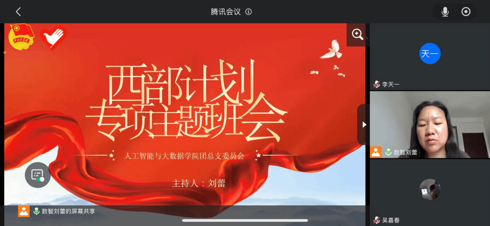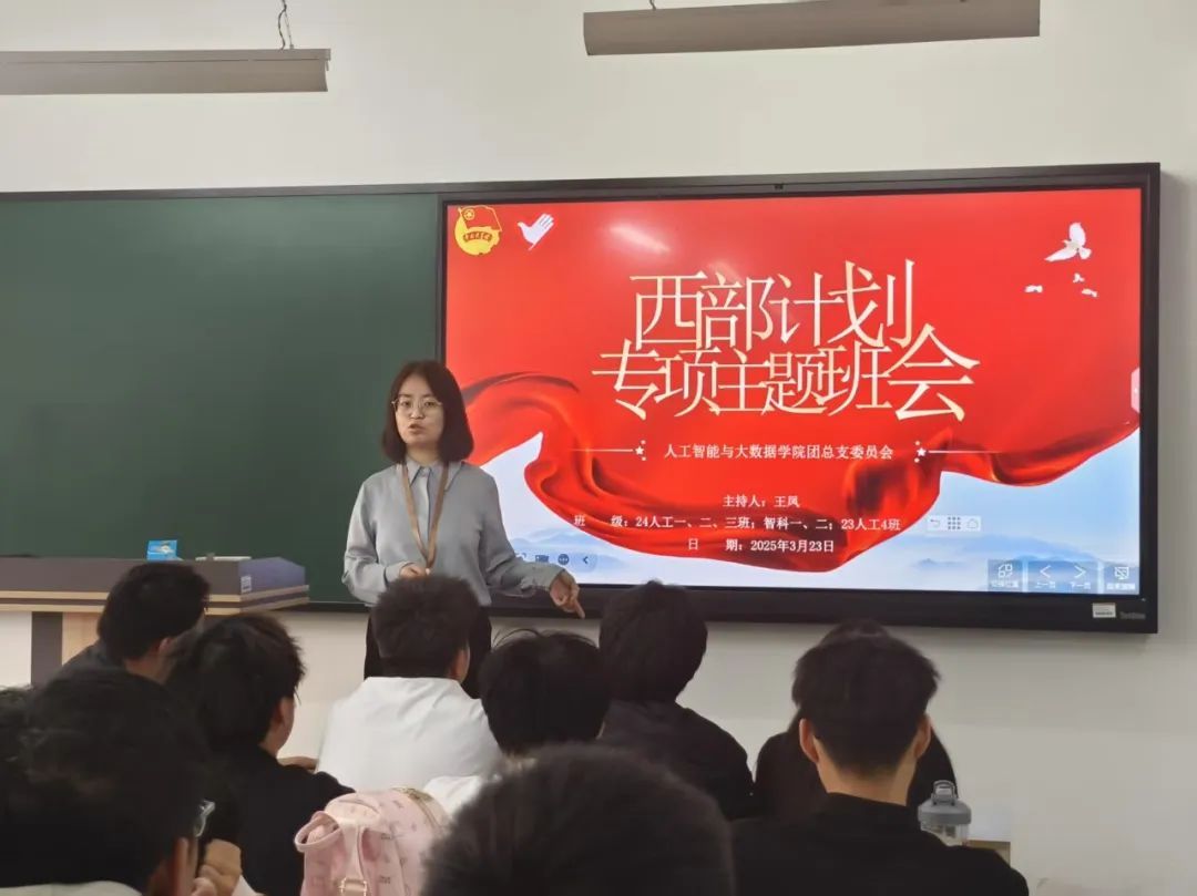 人工智能与大数据学院于2025年3月23日在线上及次教各班教室开展西部计划专项主题班会。本次班会由各班辅导员主持,大一至大四全体学生参加。由于taptap点点大四学生均在外实习,故毕业班辅导员选择采用线上班会,在校生均是线下班会。