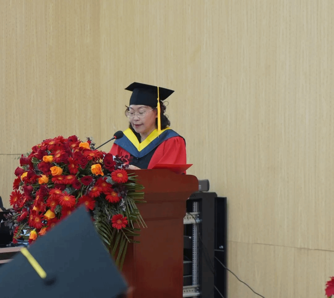 院长王静红致辞中,向毕业生表示祝贺、向师长致谢,回顾学生大学成长历程与取得的成绩,并以“心怀家国、勇于创新、砥砺奋斗”三方面嘱托共勉,愿同学们逐梦前行,母校永为后盾,祝毕业快乐、前程似锦。