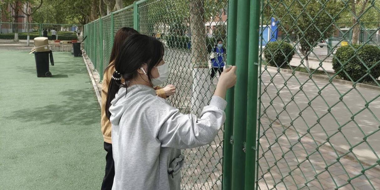志愿者清理围栏上的胶带残留
