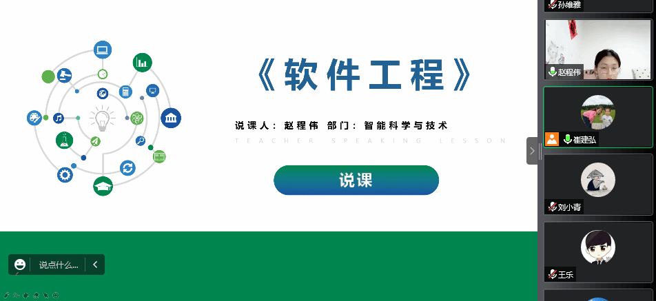 我系赵程伟老师的参赛的课程是《软件工程》,赵老师详细的介绍了本课程每个环节的设计意图,并进行了全面的说课讲解,授课过程中使用学习通以线上线下相结合的形式开展教学,这是我们值得学习借鉴的。